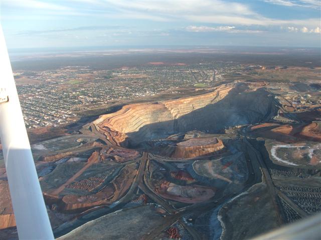 The 'Super Pit' gold mine at Kalgoorlie, right next to the city. http://en.wikipedia.org/wiki/Super_Pit_gold_mine