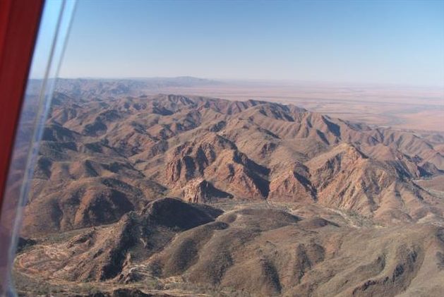 Wild geology of the Flinders Ranges, with sedimentary in the foreground and igneous beyond.