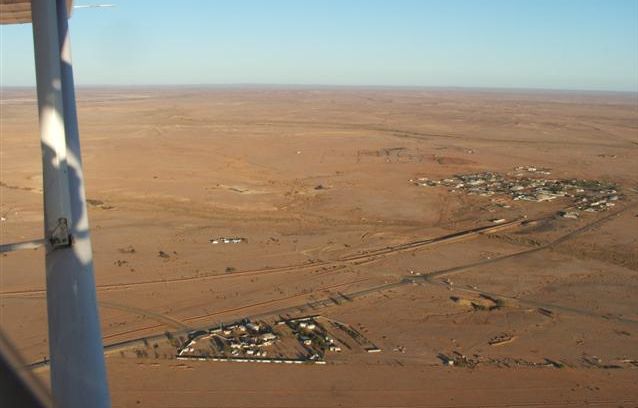 Marree, with Drover's Rest campground in foreground. This used to be the railhead, and camels carried the goods to outlying settlements. Drovers walked the cattle down the Birsdville Track from Queensland to be loaded on the rail here.