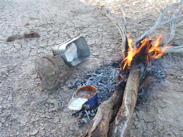 Damper (bannock) baking in the mess tin, stew warming in the can.