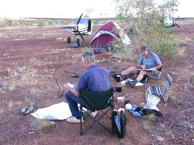 Springsure turned out to be perfect for an overnight stop. The airstrip is on top of a hill right next to town, and the scenic ‘bluff’ and surrounding mountains looked really grand in the last sunlight. We’d only just tied down and decided to camp in the ‘terminal’, a three-sided shelter with water and toilets, when Donnie and xxxxx, who live right near the strip, drove up. They took us down to the pub and we had a fine evening learning about the area. Springsure and Emerald are riding on a boom right now, with several new coal mines opening up – lots of contractors in town and work for anyone who shows up with boots on and an ability to do something useful. After a good meal and more yarns the publican drove us back to the airfield – everywhere we went we had such terrific hospitality! Next morning Donnie invited us to breakfast, then took us to the servo to fill our jerry cans. Donnie used to fly a Mooney until it got to costly, but when he saw our aircraft and what they cost to run, I reckon he’ll being flying RAAus before long.