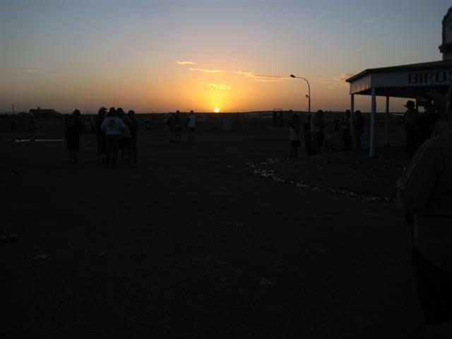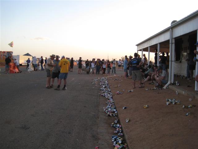 Meanwhile, back at the Birdsville Races….. I’ve never actually gone out to the race track at Birdsville, ‘cause I can’t find any interest at all in horse racing. And I wasn’t the only one, ‘cause the pub was full all of the time…. It seems that most go out there just to ‘cut loose’ and raise a bit of heck. And if they can’t ‘cut loose’ out there then where can they, eh??? The carry-on is well-tolerated by the police and officials. Despite the vast quantities of alcohol, and some pretty ‘rough and ready’ characters, there was no violence and abuse, just lots of good-natured hee-haw. And what a range of characters! Some well-dressed and manicured, normally very formally mannered, big city gentry, flown in on chartered aircraft and there to let their hair down and ‘cut loose’, with no one to take note and criticize them…. Rawhide ringers (cowboys) from local stations (ranches), taking a break from the annual muster (round-up), and seeming a bit overwhelmed by the vast crowds that had taken over their normally very quiet little town…. Road workers and crews from the remote gas fields, no-nonsense hard-working men with work boots and sun burnt necks. Hordes of 4WDrivers on their big outback adventure, taking a break from bashing over rough tracks and sand dunes. Flocks of ‘grey nomads’, retired couples towing their ‘houses’ all around the country. Everyone enjoying the scene in their own way, and no one interfering with anyone else’s way. The whole street in front of the pub was littered with empty tinnies (beer cans). Kids delighted in kicking cans and jumping on them. At sundown on Thursday the predicted wind change from hot northerly to cool southerly, blasted through with a cloud of dust and flying sand. The empty beer cans that weren’t already squashed flat, went tinkling down the street……
