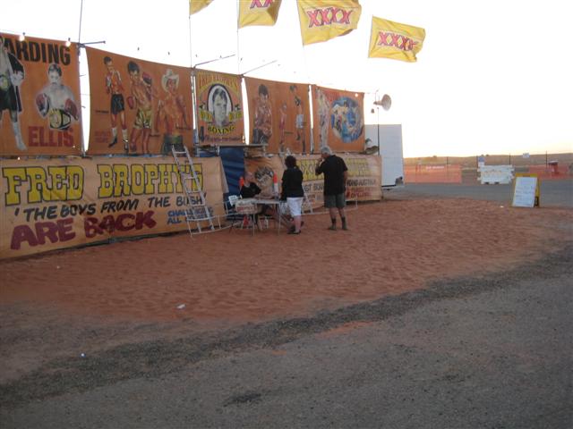 Finally inside the tent, and crowded around the canvas ‘ring’ laid out on the dirt. Brophy referees a very tight show, with careful attention to fair play, and preventing injuries. First event was two local Aboriginal boys, friends who had agreed to box each other. They were very small, and the big boxing gloves meant they couldn’t really hurt each other. They really got into the spirit and swung a lot of wild punches, ending in a draw of course. After their fight, he spread a towel in the ring and invited the audience to throw some money on it for the boys. It counted up to $410! That’ll be a fortune for those little fellas. A couple of ringers from Mt Leonard station put up really good fights against those formidable opponents. Brophy’s female boxer had lots of weight, size and experience on her side, but the lightweight Innaminka girl never flinched or backed of. Of course they couldn’t beat the pro’s, who had training and experience, and know how to cover up and not get hit, but all those volunteers were really game, and earned life-time reputations for their courage. Not many can say they’ve faced up to a formidable challenge like that, and in front of an audience…. All in good fun. Later I saw several of them drinking beer together and laughing about it all.