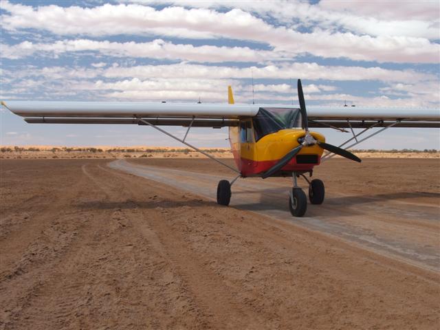 Dry salt lakes are a special challenge for off-field landings. ‘Dry’ is the key word here. If they are indeed dry and hard, then they’re excellent landing grounds. But if they’ve been flooded recently, the surface may look dry, but underneath is the consistency of custard – just a bottomless gooey muck…. It’s very hard to tell by just flying over the surface, and has caught several aircraft badly… There’d been flood rains earlier in the year, with water still lying in the troughs between dunes not far away, but in this case I could see that it was solid by the wheel tracks of 4WDs that had been crossing it recently. The safest option is usually to land on vehicle tracks, but I wanted to check out the surface to learn for another time when there may not be any tracks. So I made a run at 55 kts and touched the surface and away again, just to see what it feels like. There was a real ‘grab’ as the wheels touched the soft surface, but with this speed I was able to lift off and fly away again. It’s very important when doing this sort of touch- and-go on a surface that may be soft, to do it with plenty of speed, and gently. If you do it slowly at close to landing speed, the deceleration will instantly slow you to below landing speed, and you then will have landed whether you wanted to or not, and may be stuck there….. I circled around to look at my tracks and saw that they left quite an impression in the surface but it looked dry underneath. The drag felt on touch-down would make for a short landing, but would I get enough speed for take-off??? So I played it safe and landed on the vehicle track, which was hard and smooth – a piece of cake. Walking over the ‘lake’ surface showed that it was that typical surface when a salt lake dries out, with a soft, almost ‘fluffy’, crust of sand and salt. Underneath was dry and hard enough. So for take-off I tried the untouched surface, and with all this power and a good STOL wing it was no problem at all, only about a 4 second roll. Wa-hoo!