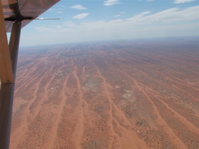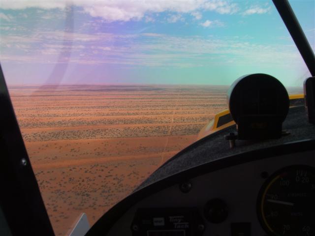 Telstra had a temporary NextG network set up, so I could get the Forecast Wind on the laptop. The hoped for south-westerly didn’t last, and by Sunday it would be back to NE, so I headed for home on Saturday. Absolutely spectacular early morning flying low across sand dunes and wide open plains (not below 500 ft of course…). Saw lots of roos, cattle, wild horses, and millions of birds around the small lakes still felt from the earlier wet season. Stopped for a meat pie at Noccundra Pub, taxi right up to the back of the pub. On to Eulo, with the long, red dirt strip right across the road from the service station so I could get a couple of jerry cans of fuel. Then on across that big belt of continuous mulga forest. Flying 7500ft to have a good chance to glide to a landing spot if needed. Sure is nice and smooth up there, but boring ‘cause can’t see much detail on the ground, and the ground seems to go by so slowly…. Finally landed at
